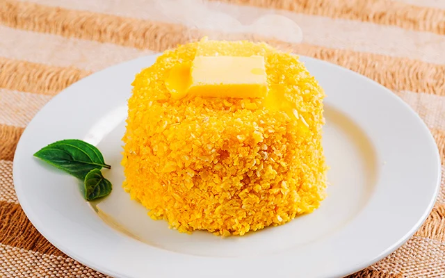 Desenforme com cuidado, adicione manteiga por cima e sirva ainda quente. O recheio derrete e se incorpora à massa, criando uma textura cremosa por dentro.